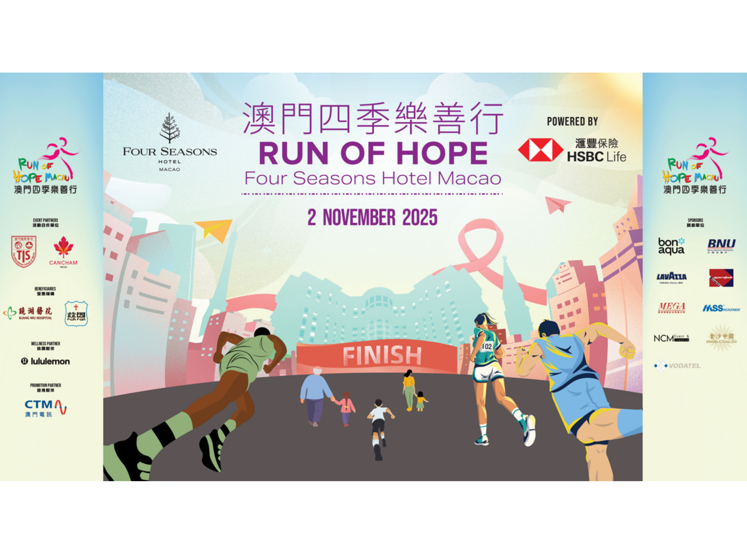萬訊贊助「澳門四季樂善行」2025 慈善賽事 於2025年11月2日(星期日),萬訊榮幸贊助由澳門四季酒店主辦,澳門國際學校及澳門加拿大商會合辦的年度慈善賽事 —「澳門四季樂善行」。活動設有5.6公里慈善跑及3公里休閒行,共同為鏡湖醫院癌症科及恩慈院兒童之家籌募善款。 透過支持這項以「希望與堅持」為核心精神的公益活動,我們展現了企業的社會責任,支持癌症患者及相關科研發展。我們將持續投入公益事務,攜手社會各界傳遞愛心與正能量。 圖片來源:澳門四季樂善行官方網站 2025/11/02